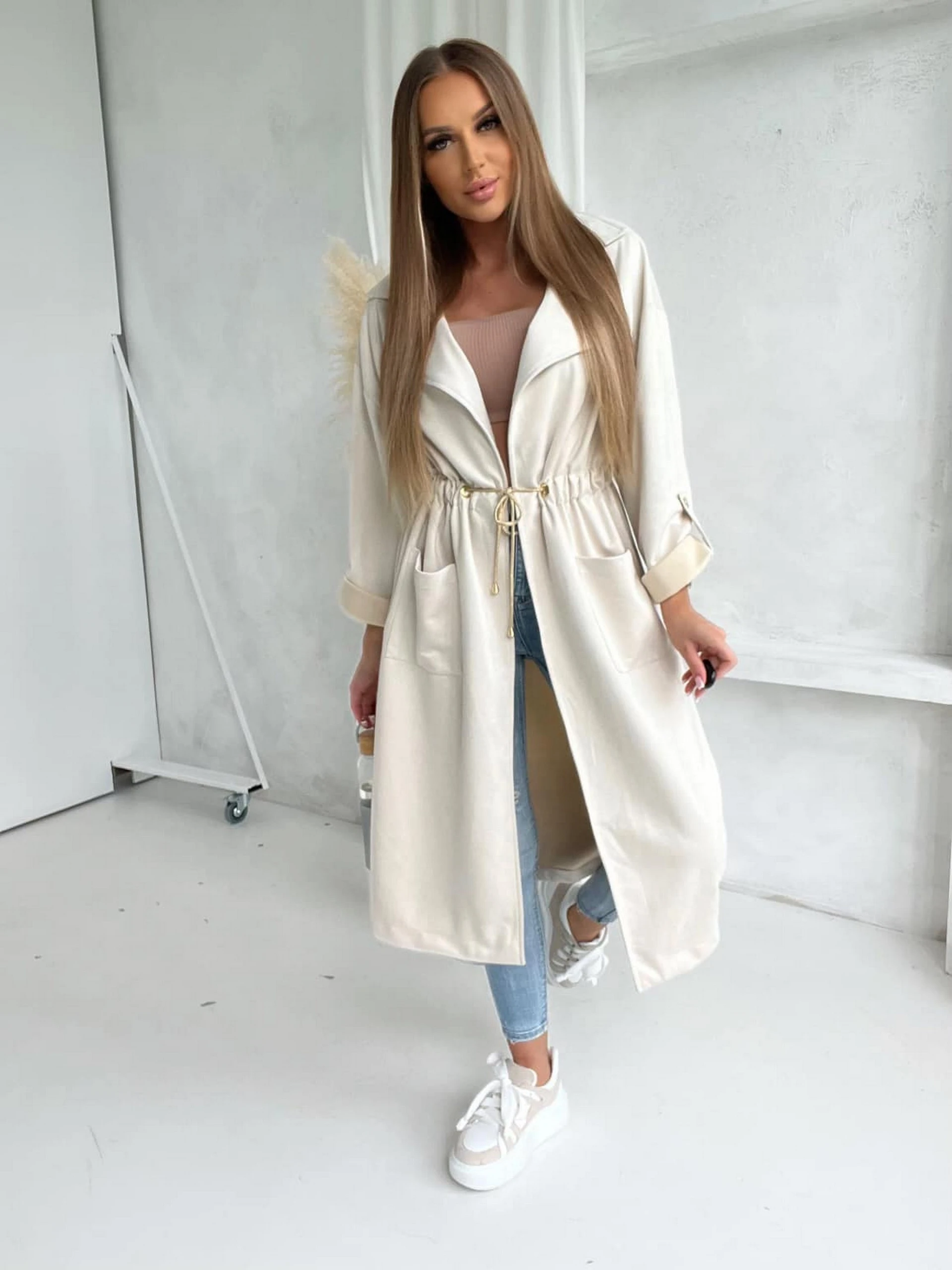 Długi płaszcz z tkaniny imitującej zamsz , z wywijanymi rękawami. Ściągany w pasie i przewiązywany ozdobnym sznurkiem.